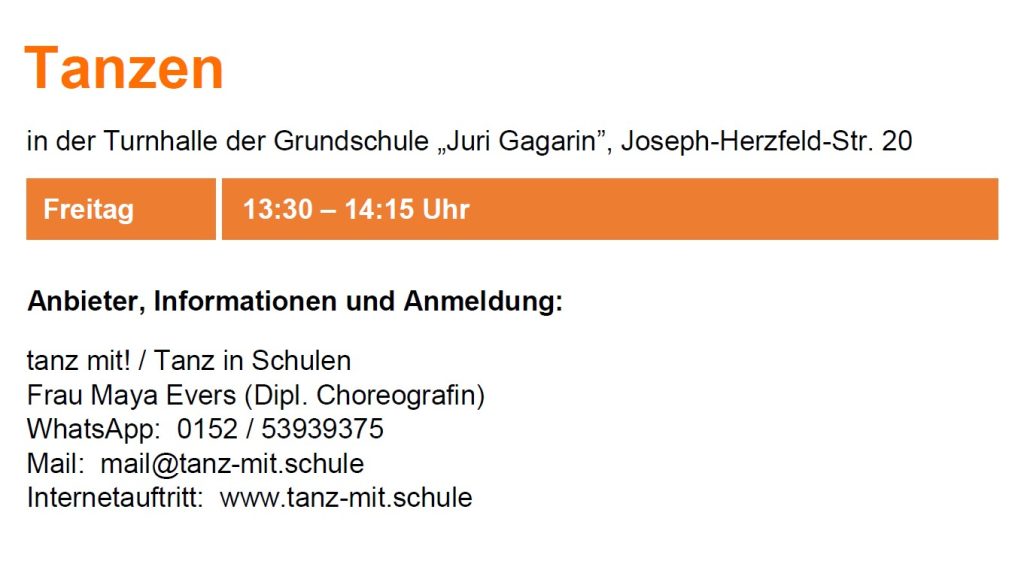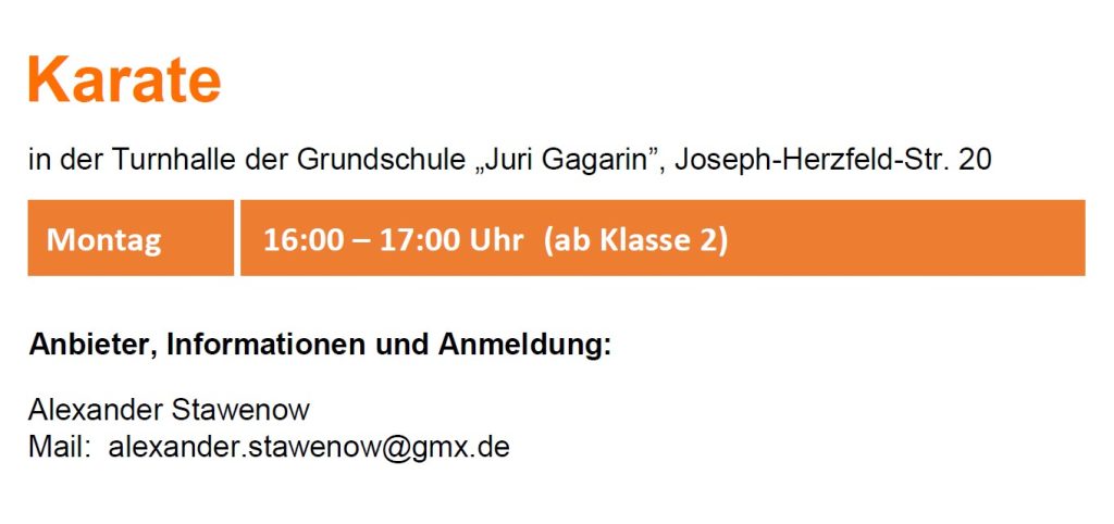 Nachfolgend geben wir Ihnen eine Übersicht an außerschulischen Nachmittagsangeboten für Schülerinnen und Schüler unserer Schule.